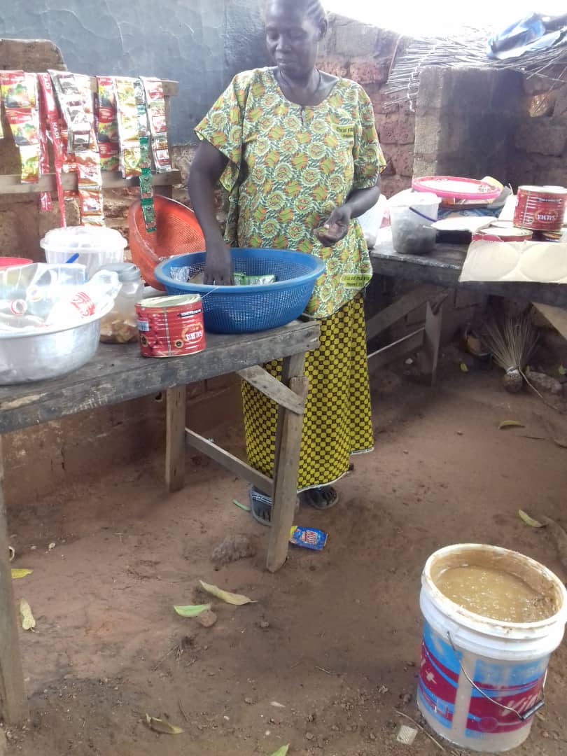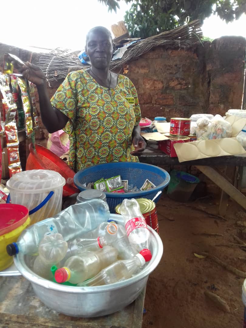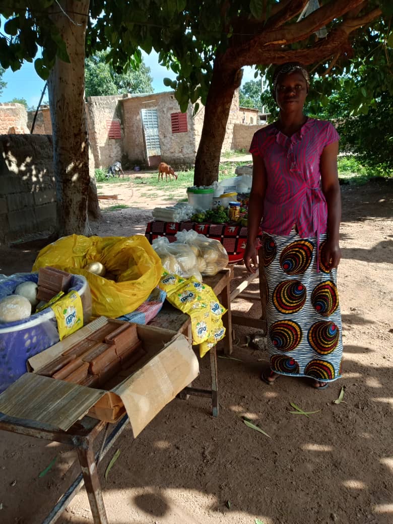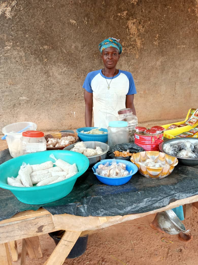 Sandrine received funding to set up a market stall selling soap, food and other basic goods